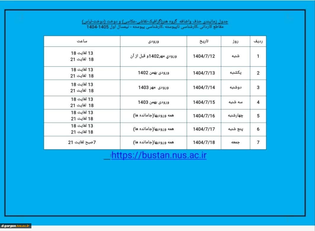 امتیاز دهید : جدول زمانبندی انتخاب واحد گروه هنر ( گرافیک ، نقاشی ، عکاسی ) و دوخت ( دوخت و لباس ) حذف و اضافه 2 یکشنبه 23 شهریور 1404 ساعت 10:58