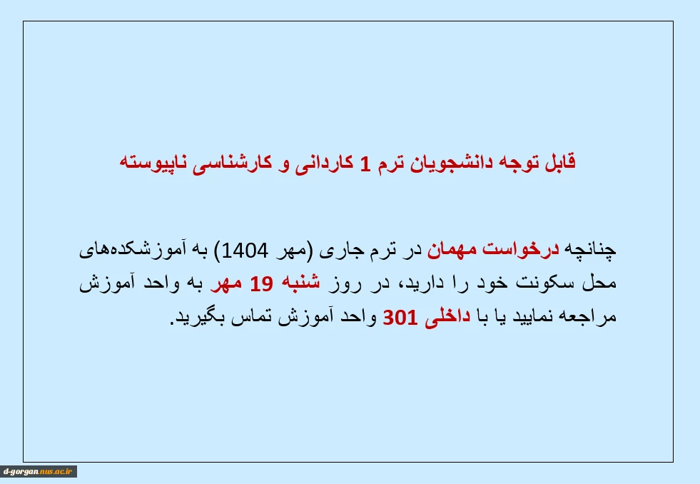 امتیاز دهید : اطلاعیه شماره 6 ثبت نام (درخواست مهمان دانشجویان جدید الورود) 2 جمعه 18 مهر 1404 ساعت 11:10