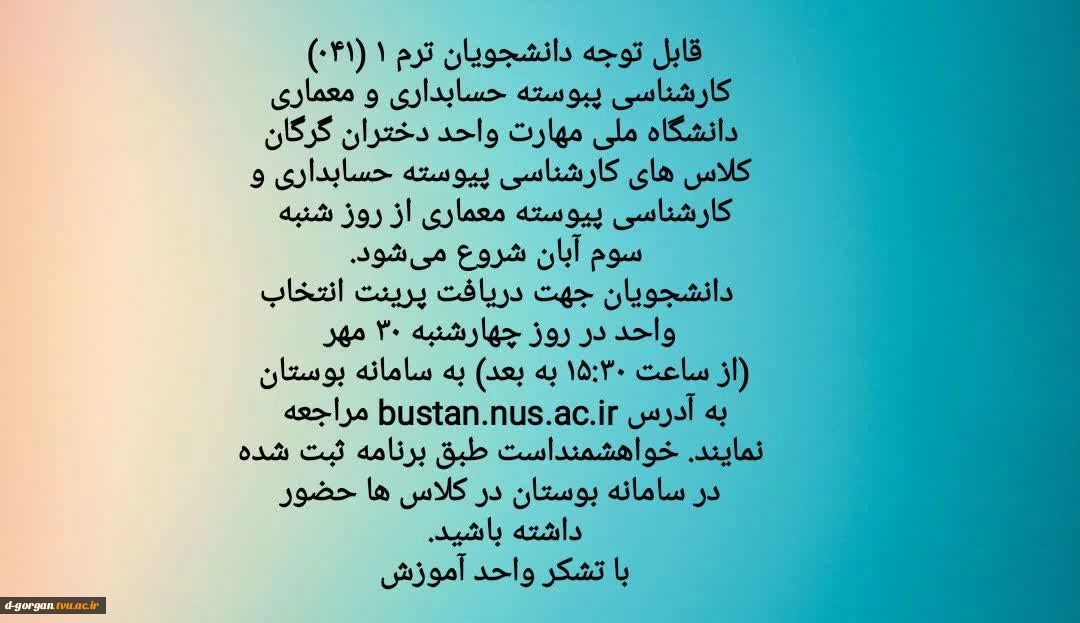 امتیاز دهید : قابل توجه دانشجویان ترم ۱ (۰۴۱) کارشناسی پبوسته حسابداری و معماری دانشگاه ملی مهارت واحد دختران گرگان 2 چهارشنبه 30 مهر 1404 ساعت 9:43