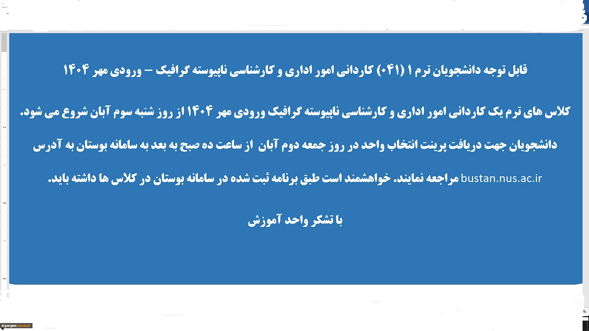 امتیاز دهید : ویژه دانشجویان ترم 1(041) کاردانی امور اداری و کارشناسی پیوسته گرافیک 2 پنجشنبه 1 آبان 1404 ساعت 1:06