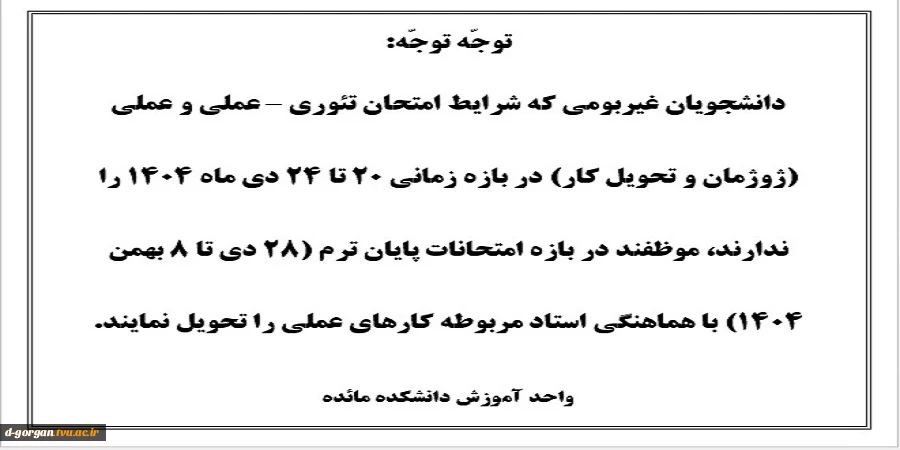 امتیاز دهید : اطلاعیه آموزش ویژه امتحان تئوری – عملی و عملی (ژوژمان و تحویل کار) ترم 041 3 یکشنبه 21 دی 1404 ساعت 13:06