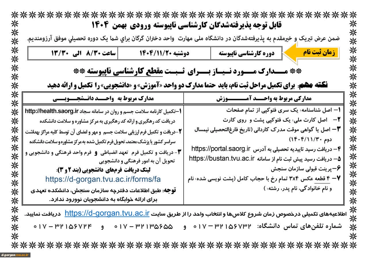 امتیاز دهید : قابل توجه پذیرفته شدگان کارشناسی ناپیوسته - ورودی بهمن 1404 2 یکشنبه 12 بهمن 1404 ساعت 9:49