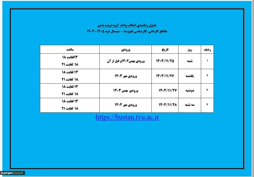 امتیاز دهید : جدول زمانبندی انتخاب واحد گروه تربیت بدنی مقاطع کاردانی، کارشناسی ناپیوسته ، کارشناسی پیوسته - نیمسال دوم ۱۴۰۵-۱۴۰۴ 2 شنبه 25 بهمن 1404 ساعت 13:10