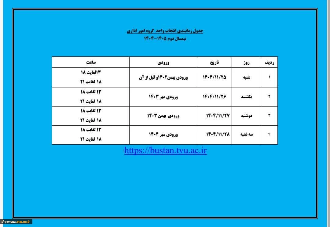 امتیاز دهید : جدول زمانبندی انتخاب واحد گروهامور اداری مقاطع کاردانی، کارشناسی ناپیوسته - نیمسال دوم ۱۴۰۵-۱۴۰۴ 2 شنبه 25 بهمن 1404 ساعت 13:15